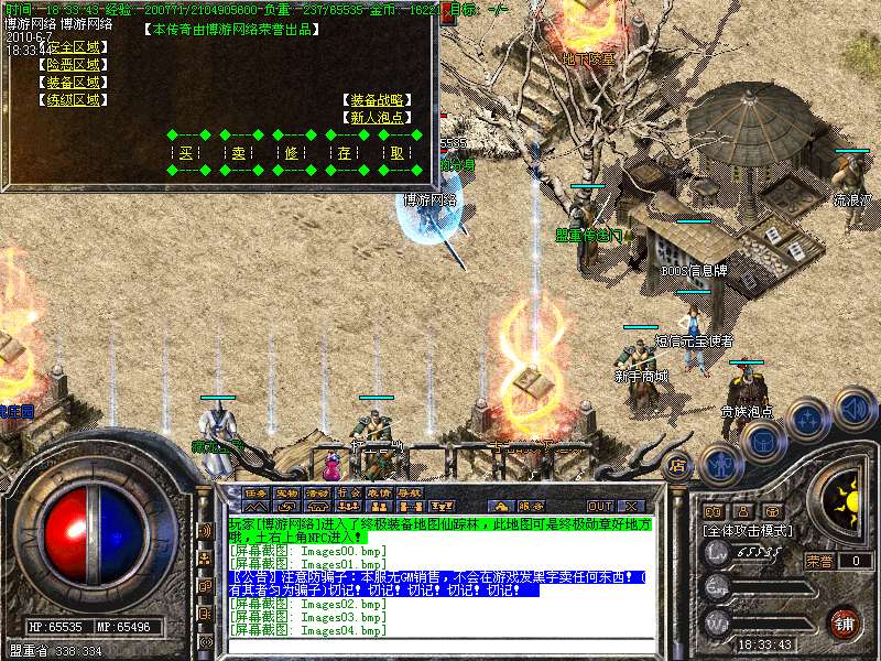服务器在幻境7层,魔龙血域,袄玛3层,王者天堂,荣誉之城,寂静3层,地下陵墓每小时刷3到5只魔龙教主!爆战神开天装备喔!别错过!寂静1到3层是新人混装备元宝的最好地方。