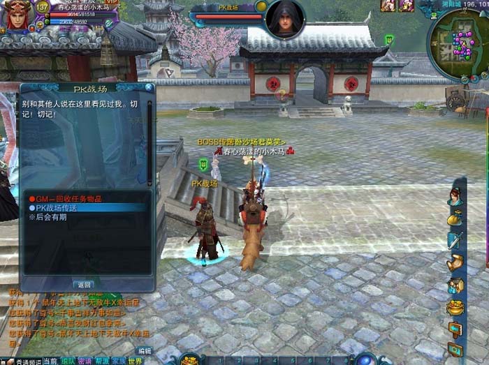 【特色】:本服有单独的PK.帮战地图.到河阳飞天仙子旁边找(PK战场NPC)报名进入.每天8点开始报名有管理负责帮战.第一名一块19玉奖励.第二名2块18玉.第三名1块18玉.【特色】:本服增加了官方的最新地图神域天空等.最新狐狸表情.最新时装.飞剑.翅膀.所有飞行动作,已完美修复.是你闲时观光.拍照的最佳选择.