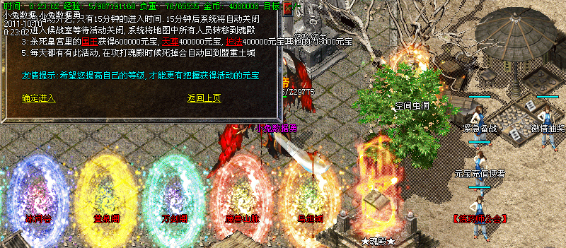 活动:魂殿,殿主(领取600000元宝) 魂殿,护法(领取400000元宝),天尊(领取400000元宝) 守城 战士,法师,道士(领取3000元宝)